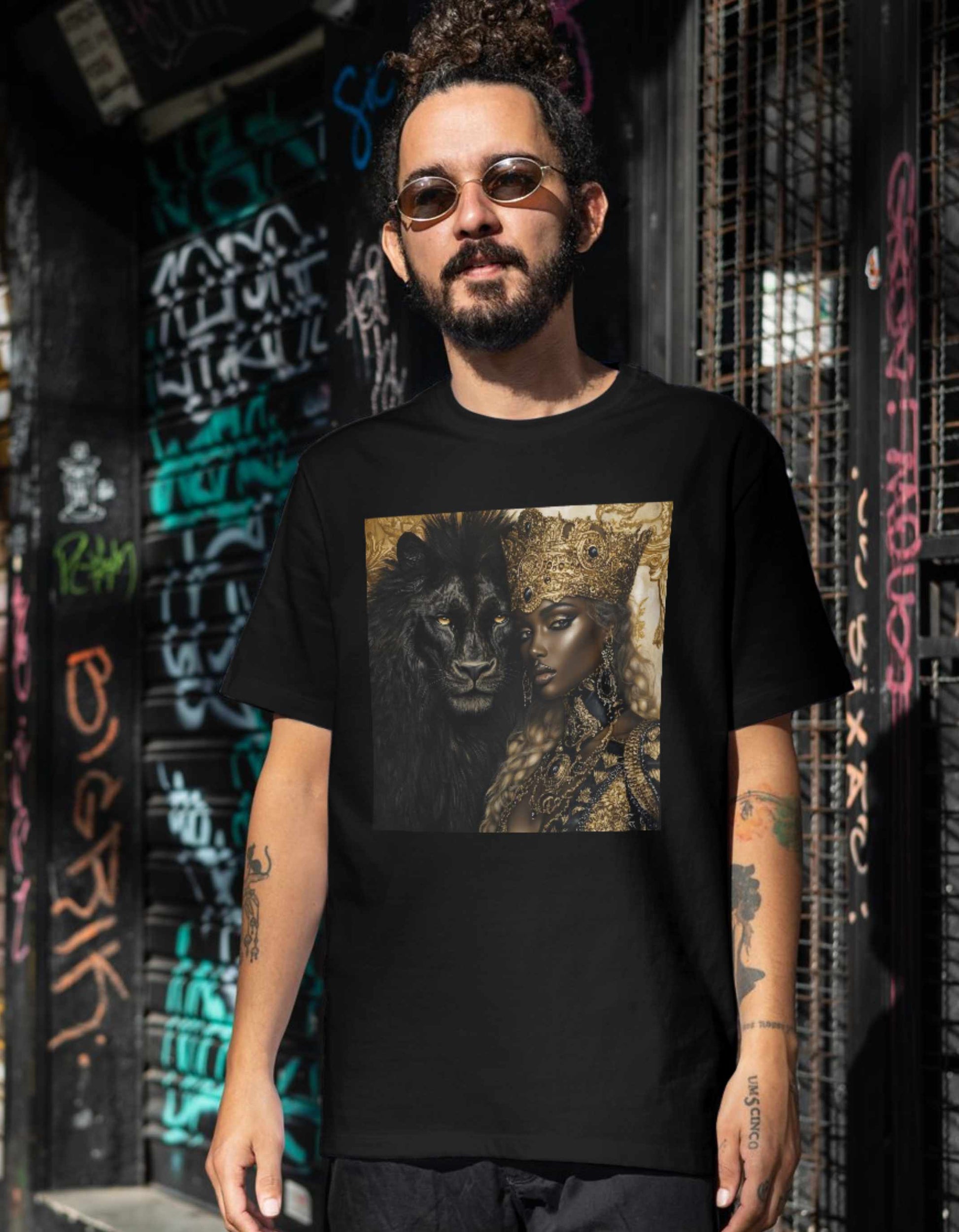 Enter a mesmerizing world with this AI-crafted digital art download of a stunning Black Queen and her loyal lion, set against a backdrop of gold and black fairytale elements. Inspired by the legends of ancient African royalty, this fantasy art piece radiates power, elegance, and mysticism. The regal queen stands tall beside the fierce lion, symbolizing unity and strength in this captivating scene.